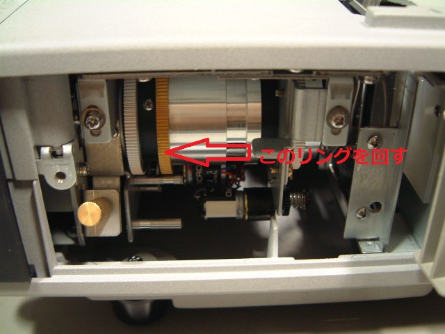 電動でズームが出来ません。 手動では可能です。 赤矢印のリングを手で回しますと、拡大・縮小出来ます。 縮小側では、スライドのマウント部まで映りますので、 リングを回してマウントが映らない様に調整します。 一度調整すると、通常の映写では殆んど操作する事は ありません。 |